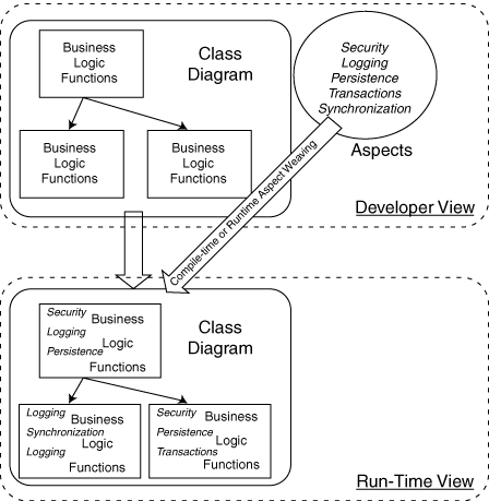 Figure 1: AOP lets you work with reusable components and allows the OOP run time to work with generated code woven with crosscutting concerns.