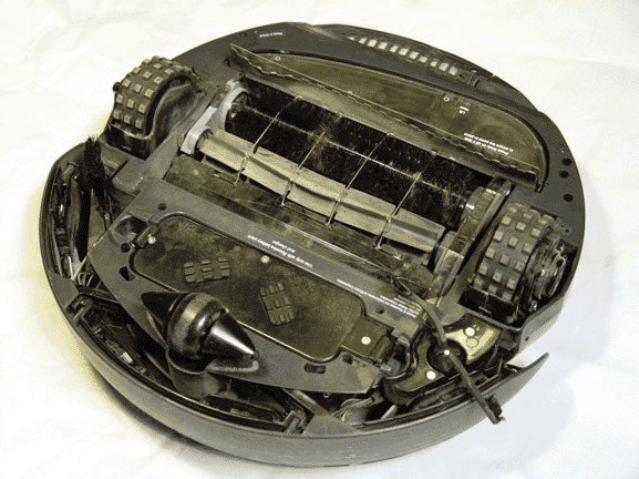 Figure 3: Roomba's underside reveals two powered wheels with a front-wheel-skid, a cleaning brush, a side-cleaning whisk, a miniature vacuum, and a fat battery.