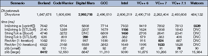 Table 2: Execution times (in ms) of the nine scenarios for the range of compilers. (Figures in bold are best results.)
