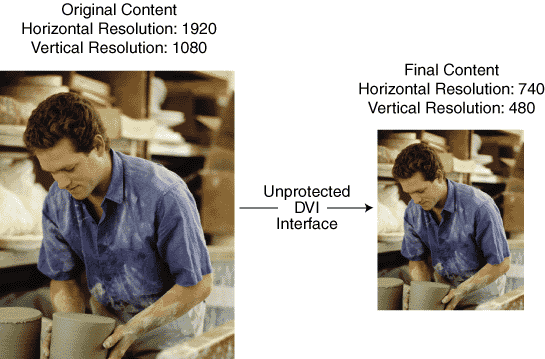 Figure 2: Under the BPDG report, if the broadcast flag is present in a stream, the MPEG demodulator must constrain the video output if the digital interface isn't secure. In this example, since the DVI display isn't HDCP capable, the video is constrained to 720×480 resolution rather than the 1920×1080 resolution of the source video.