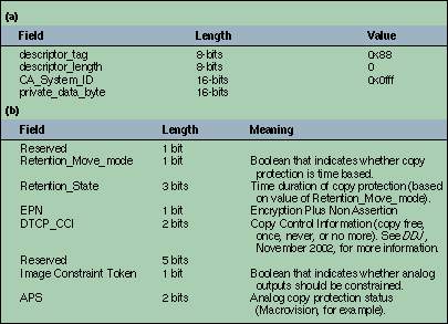 Table 3: The Image Constraint Token in the private_data_byte field of the DTCP descriptor controls whether analog outputs should be constrained: (a) format of DTCP descriptor; (b) Private Data Byte definitions.