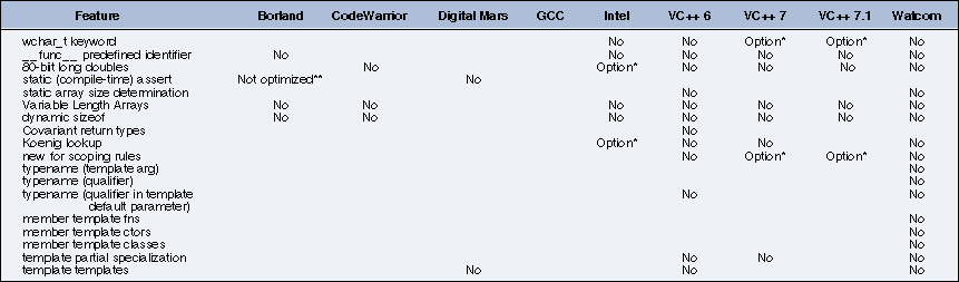 Table 1: Corrected Table 4 from "Comparing C++ Compilers" (DDJ, October 2003); C /C++ language features supported by the range of compilers. (* Available via a nondefault compiler option; ** Not optimized out in release builds.)