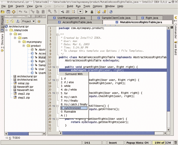 Figure 2: Use the Surround With lookup list to enclose the bodies of the generated methods with synchronized{} blocks.