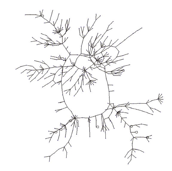Small part of the yeast protein network. Nodes are proteins, edges are bindings between them.