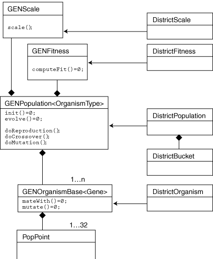 Object diagram of Texas redistricting implementation derived from the genetic-algorithm framework.