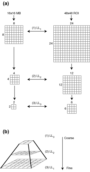 Figure 7: (a) Wavelet decomposition for hierarchical block matching; (b) resulting multiresolution pyramid.