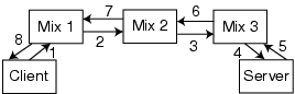 Figure 2: Retrieving a web page using a mix-net. (1) The client sends the layered encrypted URL to mix 1. (2) Mix 1 removes one layer of encryption from the URL and sends it to mix 2. (3) Mix 2 removes the next layer of encryption from the URL it received from mix 1 and sends it to mix 3. (4) Mix 3 removes the next layer of encryption from the URL it received from mix 2. This reveals the client requested URL. Mix 3 contacts the server, specified in the URL, and requests the specified document. (5) The server sends the requested document back to mix 3. (6) Mix 3 sends the document to mix 2. (7) Mix 2 sends the document to mix 1. (8) Mix 1 sends the document to the client.
