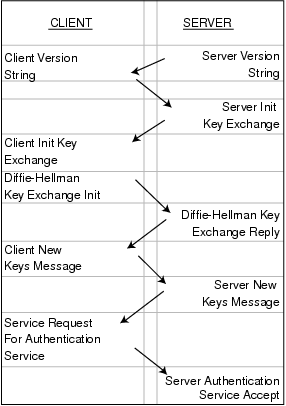 Initial packet exchanges negotiating cryptographic keys in SSH.