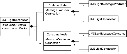 The JMSLightDestination class stores references to producers and consumers within nested classes.
