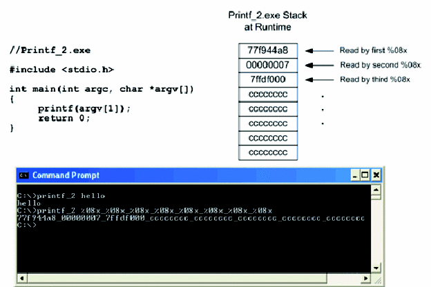 An application with a simple format-string vulnerability can be manipulated to expose data on the stack using by using %08x.