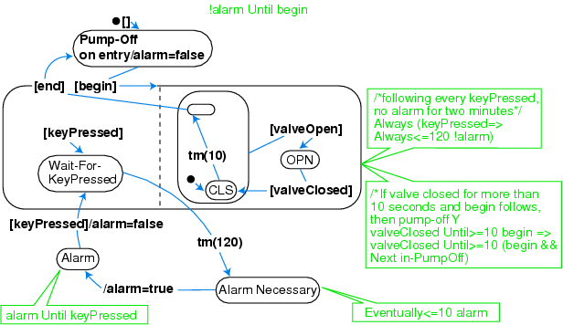 Statechart for the infusion pump control with embedded formal specification assertions.