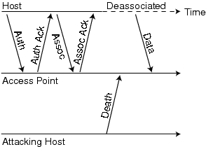 Authentication attack. Host follows standard Authentication/Association sequence. Access point terminates session after deauthentication from attacking host.
