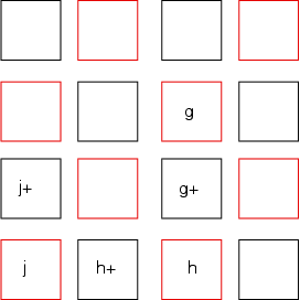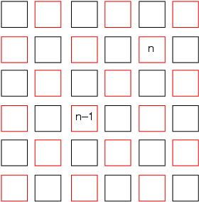 In Figure 2, n and n-1 are well separated. Consider a collection of well separated red squares and put the highest red pieces on them. The red square having n on it must have two black pieces neighboring it having numbers greater than n on them. The red square having n-1 on it may have a black piece with n on it, but also another one greater than n. Each well-separated red square must, therefore, consume a black piece value greater than n. Note that the diagonals containing well-separated red squares (i) alternate between well-separated red squares and others; and (ii) must be surrounded by diagonals of red squares that have no well-separated red squares. Therefore, the number of well-separated red squares increases with n/4. Black must use n/2 pieces to cover those, half of those (n/4) must be greater than n and the others must be at least 3n/4. So, these n/2 black pieces must have greater values than any other red pieces. We call those black pieces the high dominators. Further, Black can arrange it so that every empty red square is the neighbor of at least one high dominator. So any piece put on an empty (not well separated) red square can be covered by the high dominator already placed as a neighbor plus one other black piece having a value less than n. Therefore, k is c+n/4, where c is a small constant independent of n. In fact, I conjecture that c is about 2.