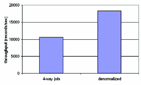 The simple scan necessary with the denormalized lineitem relation performs much better than the four-way join necessary with the normalized schema.
