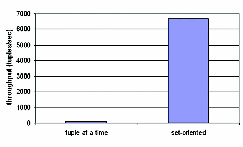 Query processed in a single statement (set oriented) performs much better than a loop evaluating this query one tuple at a time.