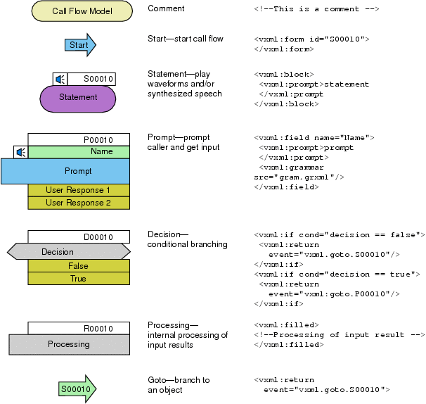 Call-flow objects with their descriptions and VoiceXML.