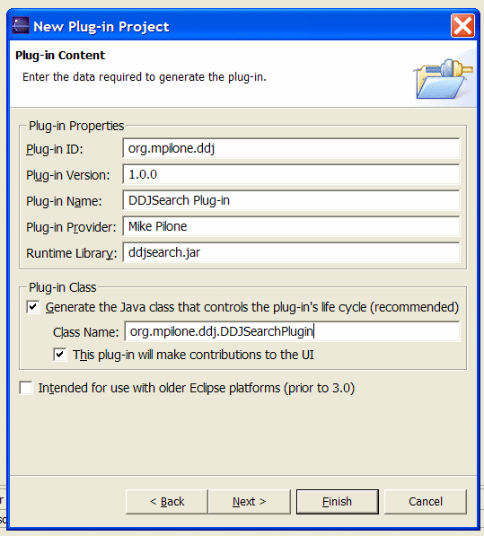The New Plug-in Project dialog with the customized values.