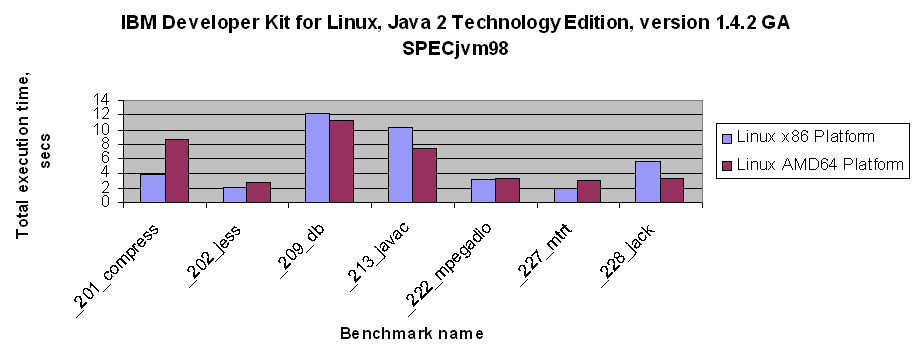 Performance of 32-bit and 64-bit versions of IBM Developer Kit for Linux, Java 2 Technology Edition, Version 1.4.2 GA in SPECjvm98 benchmarks on the AMD64 platform.