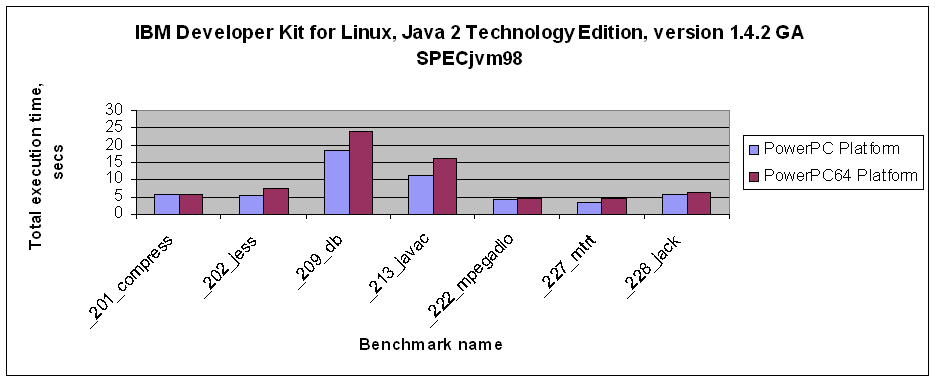 Performance of 32-bit and 64-bit versions of IBM Developer Kit for Linux, Java 2 Technology Edition, Version 1.4.2 GA in SPECjvm98 benchmarks on the PowerPC64 platform.