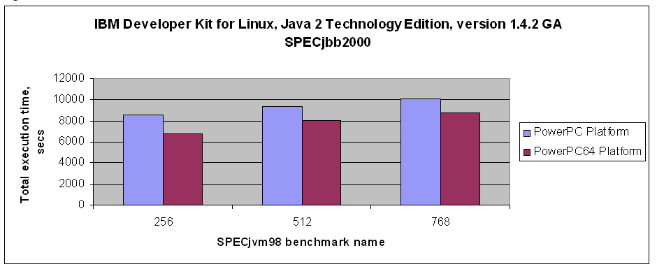 Performance of 32-bit and 64-bit versions of IBM Developer Kit for Linux, Java 2 Technology Edition, Version 1.4.2 GA in SPECjbb2000 benchmarks on the PowerPC64 platform.