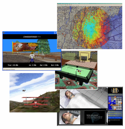 Collection of available Java3D applications, from top to bottom: Builder RF Visualization Tool, Cassos, CazaPool3D, FlyingGuns, Law and Order II.
