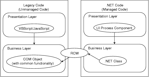 Common business functionality is encapsulated in a COM object and accessed from .NET managed code by the RCW.