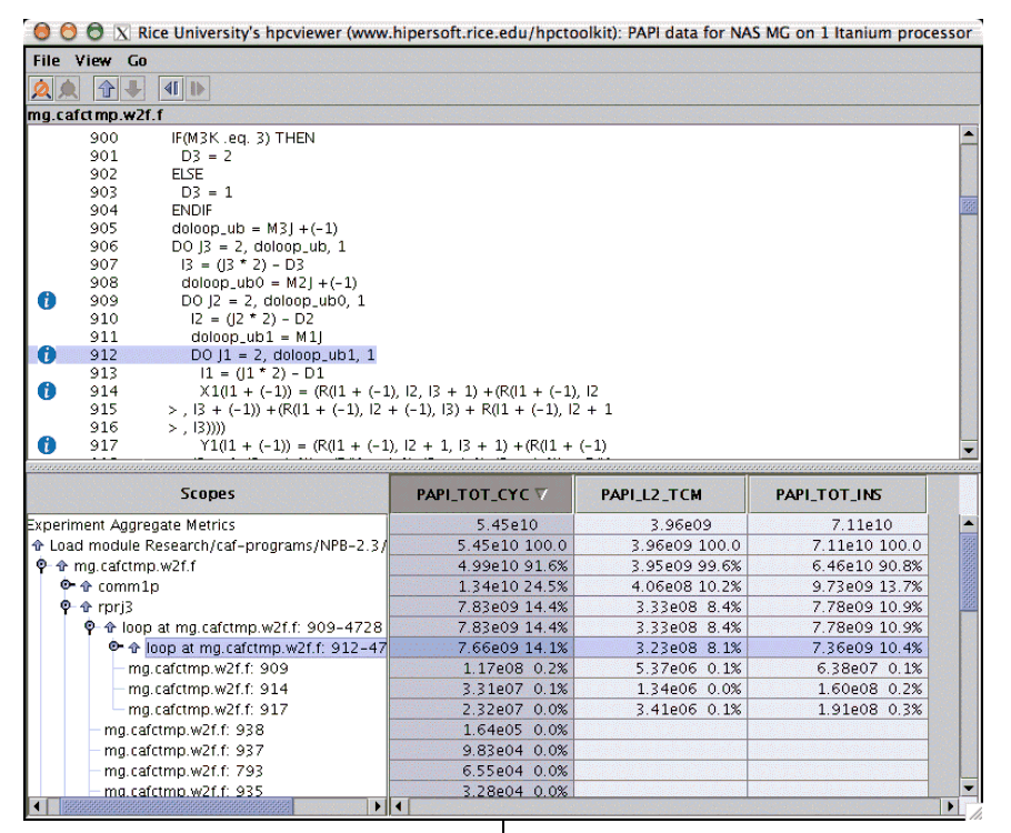 HPCview showing PAPI events gathered from hpcrun for a triply nested loop.