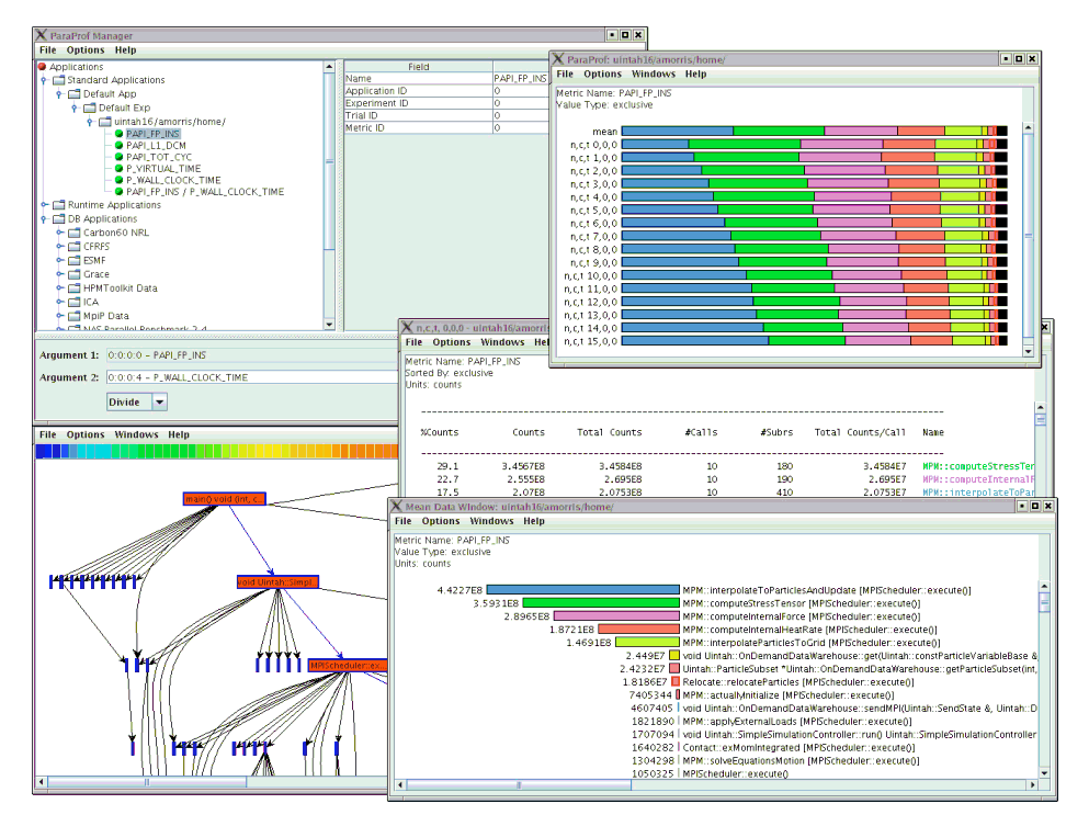 TAU display of the performance of a 16-process MPI program with multiple PAPI metrics, subroutine breakdown, and call graph display.