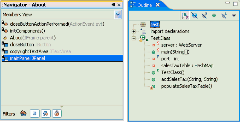 NetBeans shows the Navigator display, while Eclipse shows the Outline view.