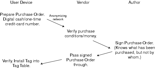 Privacy-preserving purchase. Identity of user hidden by anonymizing network and digital cash. Tag Table Identifier is embedded into Purchase Order using a one-way function.
