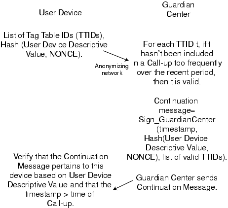 Figure 5: Privacy-preserving Call-ups. User knows that it is talking to the Guardian Center but not vice versa (an option of SSL). TTIDs do not reveal the associated Tags. The one-way hash function associated with the NONCE prevents any revelation of the User Device Descriptive Value, so even processor identifiers can be used without fear of privacy breach.