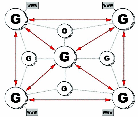 Figure 2: High-powered Media Grid nodes (indicated by the big Gs) provide storage, delivery, and processing services to other devices, including less capable devices that can only consume services (indicated by the smaller Gs) and standard web-enabled applications such as web browsers and rich clients. Red arrows denote high-speed connections between nodes, while gray and black lines depict traditional broadband connections such as DSL and cable modems.