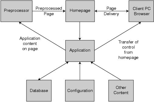 Figure 2: At the center is the application, which is fed by the database, configuration files, and content from other servers. The application page is preprocessed into the homepage, which is delivered to the site visitor's PC. Site visitors would use the homepage navigation to enter the application, where control transfers to the application.