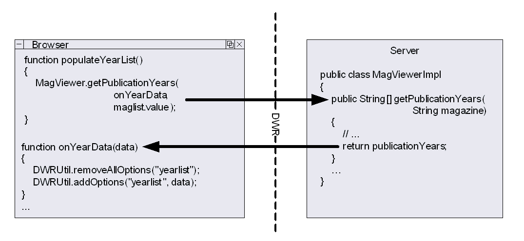DWR acts as a proxy between the client JavaScript and the server's Java classes.