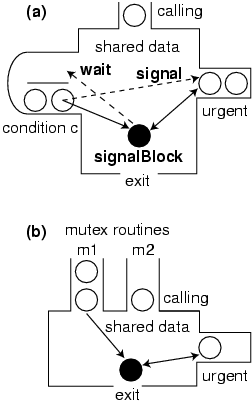 Monitor synchronization: (a) condition variable; (b) accept statement.
