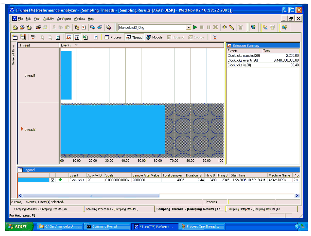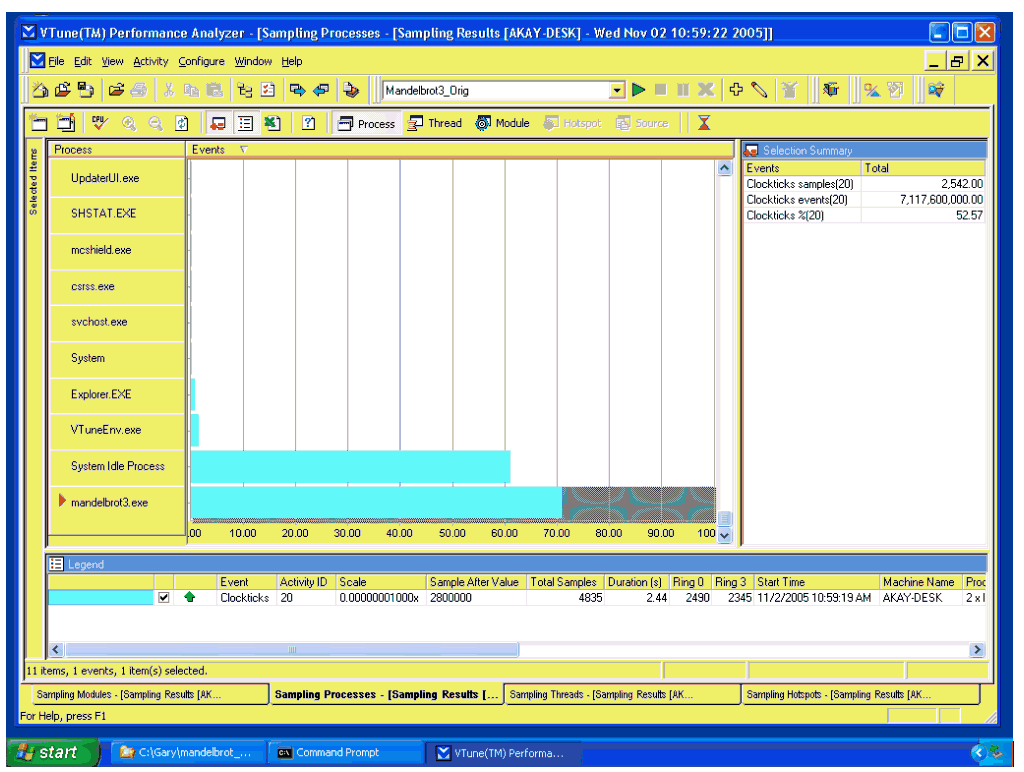 Figure 1 is the Process View in the VTune Analyzer 7.2 for Windows after collecting sampling data on the platform. It shows the majority of CPU time being spent in the System Idle Process and our example program. The fact that the amount of CPU time spent in the System Idle Process is a large fraction of the total CPU time during the data collection run indicates that significant CPU resources are not being used. This is expected given that we ran only the example application, the application is single threaded (and therefore only ran on 1 CPU), and the application is running on a machine with 16 logical processors.