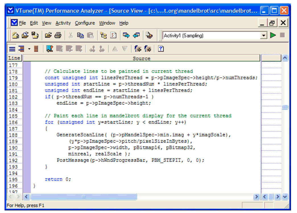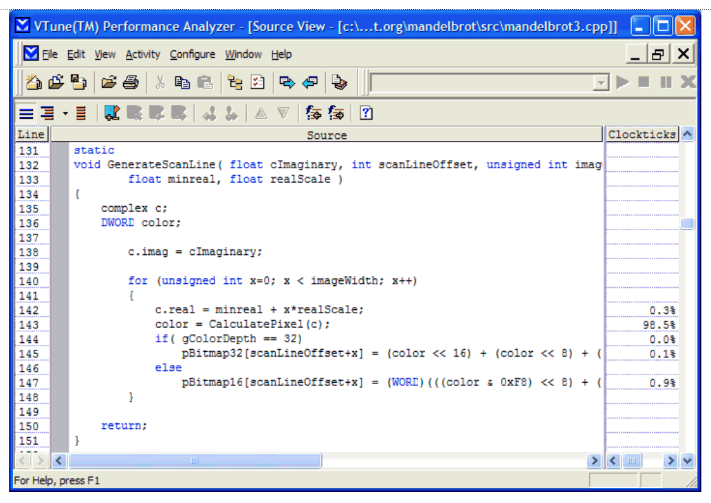 Figures 2, 3, and 4 show the executables that consumed time in the Mandelbrot process, all the threads in the Mandelbrot app (only one thread that does any significant computation), and the Source View of the application's main bottleneck. The Source View shows that about 99 percent of the CPU time used by the application was spent in the function GenerateScanLine. To improve performance, you could try to change the code in this function so it would run faster. However, since we are running the application on a multicore machine, let's see if it makes sense to create threads to distribute the workload. Fortunately, there is a single location of intense computational activity that lends itself to threading. If there hadn't been any dominant hotspots, it would be more difficult to figure out what work to distribute across the processors.