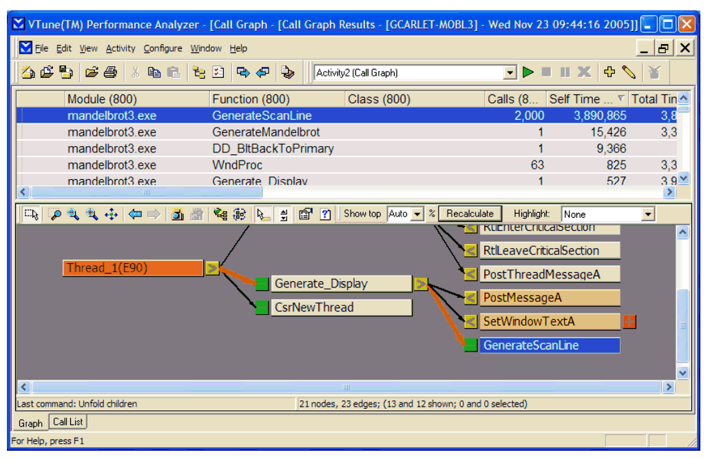 The Call Graph display tells us that Generate_Display and GenerateScanLine are on the time-critical path because the functions are on the most time-consuming calling sequence as indicated by the thick red arrows. This is a good indication that we are focusing on the right subgraph. Also, the Self Time for Generate_Display is low compared to the Self Time for GenerateScanLine. This means that most of the time is consumed in GenerateScanLine. By putting the calls to GenerateScanLine into separate threads, the application work can be partitioned among the available processors.