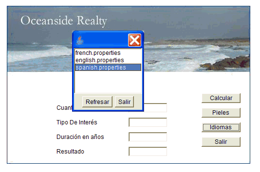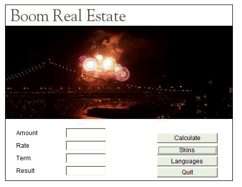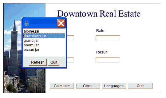 It's easier to understand the approach I present here if you can look at a sample application that implements the design. The sample application I use is a mortgage calculator that calculates conventional American mortgages and has functionality for loading skins and languages (both skins and languages will be delivered via incremental deployment). The interface is essentially the same for choosing skins and languages, so I only use one (skins, in this case) to explain the user experience.