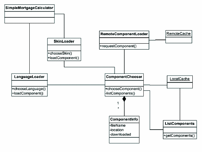 Figure 3 is the class diagram for the main classes involved in the managing components for the sample implementation. To understand Figure 3, the best place to start is ComponentInfo, the class that models the components. This class has information about the filename of the component, the location (which is the URL from which the component can be downloaded), and whether it is on the local filesystem (for instance, whether it has been downloaded in the past). The ComponentInfo list is created whenever users indicate that they want to choose a component, and represents the union of the components available on the local filesystem and those that are available for download. The ComponentInfo list is aggregated in the ComponentChooser, which uses the list to populate the list of components available (for example, the list of skins in Figure 1). If users select a component that is available on the local filesystem, it is loaded immediately. If users select a component that is available for download, ComponentChooser requests that the component be downloaded via RemoteComponentLoader. RemoteComponentLoader takes the location and filename from the ComponentInfo and downloads the remote object (for example, a skin) to the local cache (for a skin, this would be the skins directory), spooling it to a file with the filename for this component (for example, the Boom Realty skin can be downloaded from http://www.lithic.com/ddj/skins/boom.jar and spooled to [application root]/skins/boom.jar).