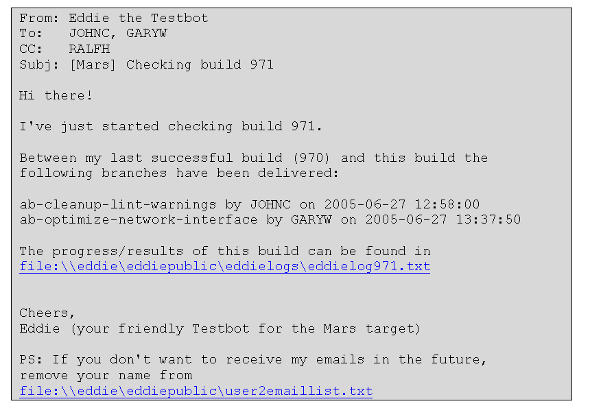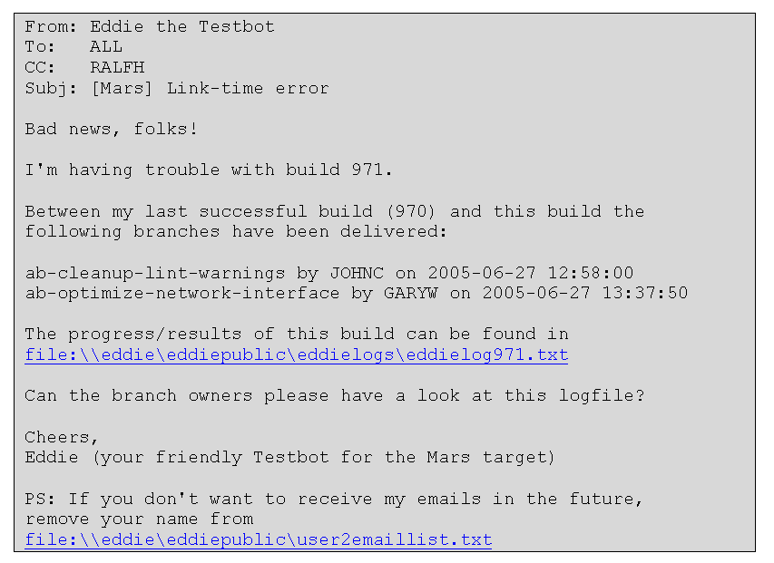 A small disadvantage of the testbot I've just described is that it heavily relies on e-mail notification. Oftentimes, developers complain about the flooding of e-mails that the testbots send, just because some developer caused a Lint warning on a target they are only marginally interested in.