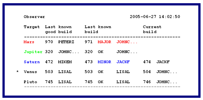 In addition to the e-mail-notification mechanism, there is a client program called "Observer" (implemented in Perl/Tk) running on all project member's workstations. The Observer monitors the state of all targets. The following information can be derived from Figure 3: