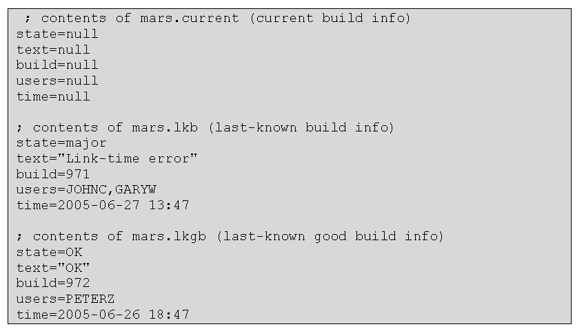 To provide Observer with build and test state information, the testbots drop cookies on a shared file server directory. Figure 4 presents the contents of the cookie files for a particular target. The Observer regularly checks this shared directory for changes and displays the information in a user-friendly dialog.