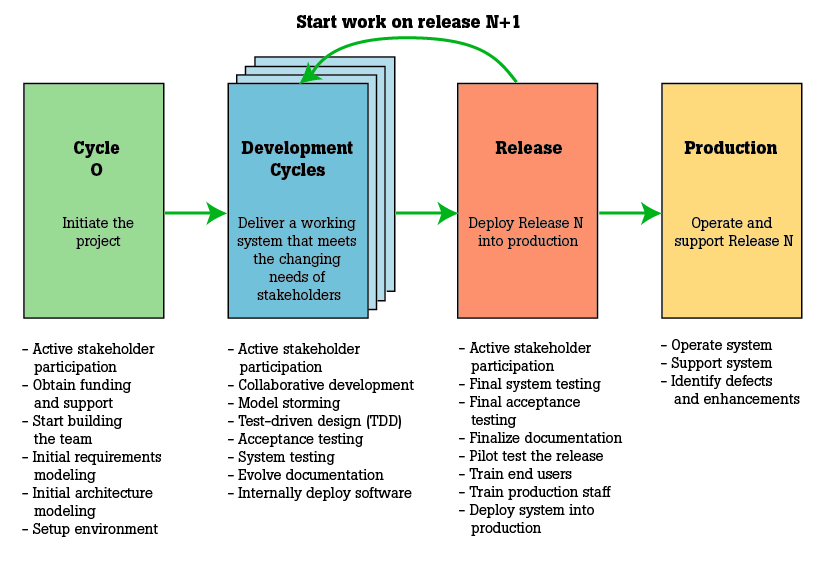 During development cycles, we work closely with both our stakeholders and with other developers. We do this to reduce risk through tightening the feedback cycle and by improving communication via closer collaboration. We implement functionality in priority order, allowing our stakeholders to change the requirements to meet their exact needs as they see fit. The stakeholders are given complete control over the scope, budget, and schedulethey get what they want and spend as much as they want for as long as they're willing to do so. We analyze individual requirements by model storming on a just-in-time (JIT) basis for a few minutes before spending several hours or days implementing the requirement. Guided by our architecture models, often hand-sketched diagrams, we take a highly collaborative, test-driven development (TDD) approach to development where we iteratively write a test and then write just enough production code to fulfill that test. As required, we refactor our application code and/or our database schema to ensure that we have the best design possible. By taking this approach, we incrementally deliver high-quality working software that meets the changing needs of our stakeholders.
