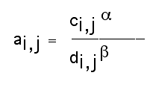 di,j is the length of the route under consideration. The longer the route, the less attractive it will be. This term is also weighted by another power term