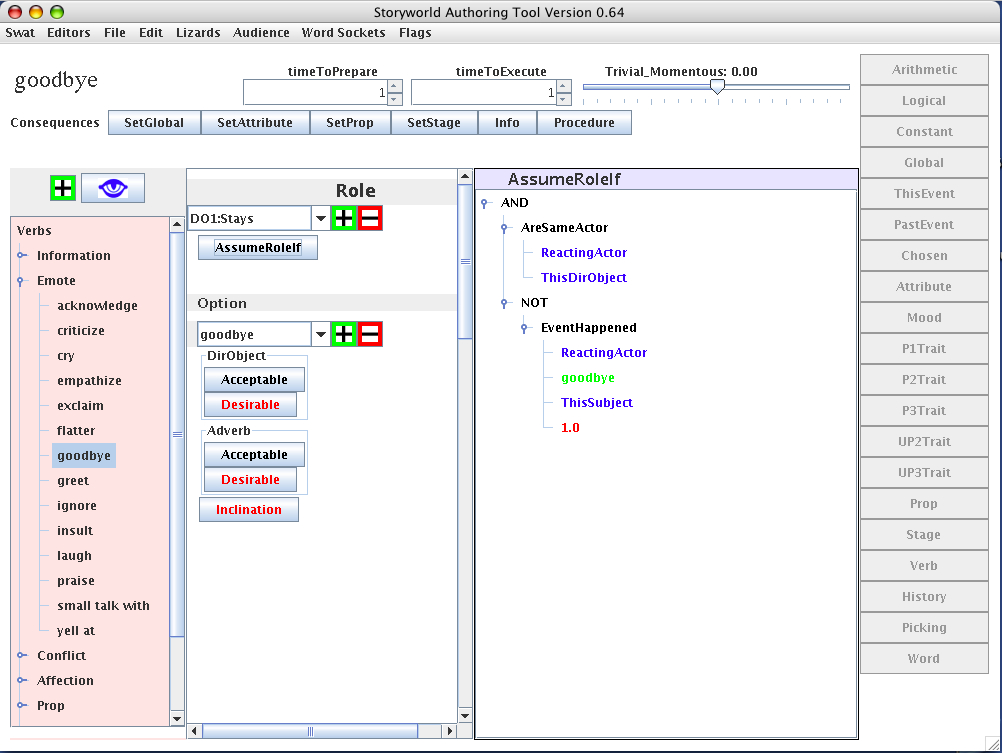 CC: The storybuilder does not get to create types. I create the types. And every [datatype] is color-coded: Booleans are black, actors are blue, quantifiers are purple. I think this is useful for amateur programmers. Another thing: Runtime errors are survivable. It happens by virtue of the design of the system that runtime errors only occur when we are considering an action or changing something, and when that happens, we say it poisons that calculation. This invokes a system called "Poison" that logs it for future reference. "Rehearsal," our testing feature, plays the storyworld one way, adjusts a random number, does a thousand passes, and then presents you with a statistical analysis. You had this many poisoned events. Looping cycles. Thread killers.