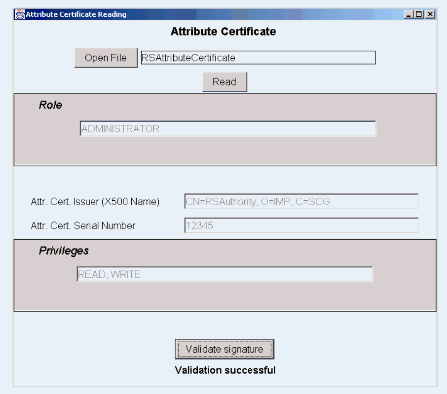 The Role Specification Attribute Certificate could contain privileges as plaintext or XML files, while field RSACHolder is of String type. In our application, RAAC has been implemented in package jace1.*, while RSAC has been implemented in package jace2.*.
