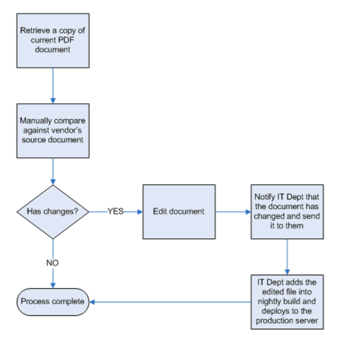 What we needed was a way to get the source from the vendor, take this information and compare against what we have, and, if need be, generate the PDF automatically (Figure 2). This would eliminate the need for a full-time employee to spend valuable work-hours constantly updating this document as well as improving the product quality.