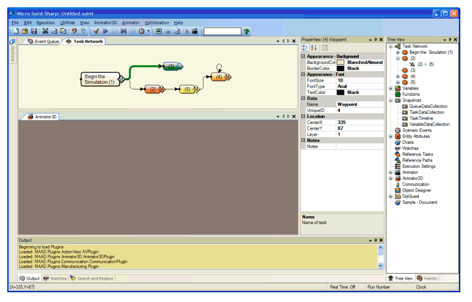We have developed plug-ins for animation (both 2D and 3D), importing and exporting data from Microsoft Visio, adding a human model to the simulation engine, interacting with Microsoft Excel, and optimization. Additionally, a number of our customers have written their own plug-ins to modify the simulation and add capabilities to their simulation models. The concept of developing plug-ins has also benefited the consulting side of our business. We can develop custom plug-ins that can be easily integrated with Micro Saint Sharp by adding the necessary DLLs to their application folder and launching the application.