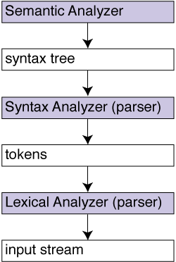 Unfortunately, Figure 1 can be misleading in suggesting that the three phaseslexer, parser, semanticsare independent and operate sequentially without overlaps. In fact, the input can first be entirely tokenized, then its syntax tree derived, and finally all the semantics evaluated on top of this tree. Consequently, you'd think you could design the lexer, parser, and semantic analyzer as separate, distinct problems. While this might be true for simple languages and applications (such as command-line calculators), it isn't true for complex languages like C. For C, it isn't even possible to complete the lexical analysis of a token before some semantic analysis has been completed for the preceding input. For instance: